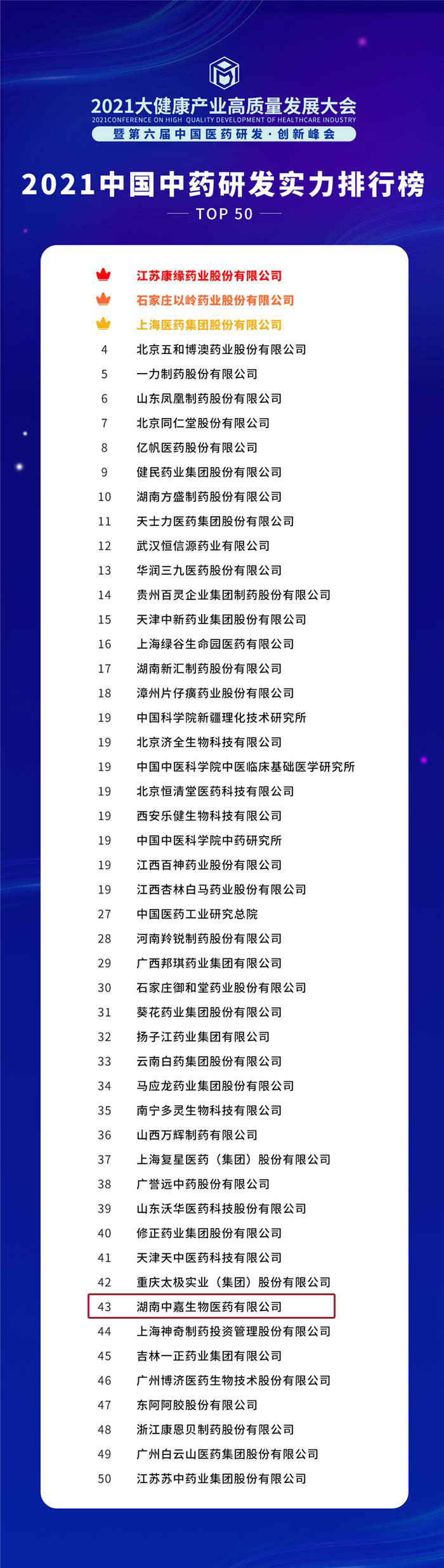 近年來,國家大力扶持和促進中醫(yī)藥事業(yè)發(fā)展,把中醫(yī)藥發(fā)展擺在突出位置,多次決策部署,出臺中藥科技產(chǎn)業(yè)支持政策,從《中醫(yī)藥發(fā)展“十三五”規(guī)劃》、《關(guān)于推進中醫(yī)藥健康服務(wù)與互聯(lián)網(wǎng)融合發(fā)展的指導意見》、《中醫(yī)藥法》指導中醫(yī)藥產(chǎn)業(yè)發(fā)展到2020年《藥品注冊管理辦法》與《中藥注冊分類及申報資料要求》對中藥新藥研發(fā)提出新要求,無不為中醫(yī)藥傳承創(chuàng)新發(fā)展指明方向,推動“中醫(yī)藥振興發(fā)展迎來天時、地利、人和的大好時機”。且隨著老齡化加劇,人們對于預(yù)防勝于治療,未病先防和既病防變的健康意識提升,具有“治未病”獨特優(yōu)勢的中醫(yī)藥更是迎來發(fā)展良機,尤其在2020年抗擊新冠疫情中彰顯出的中醫(yī)藥在重大疾病防治中不可或缺的重要作用,為中藥新藥研發(fā)帶來新的發(fā)展機遇,也為振興中醫(yī)藥發(fā)展,走向國際迎來契機。事實上,發(fā)掘祖國醫(yī)藥瑰寶、傳承創(chuàng)新中醫(yī)藥精華,以科技創(chuàng)新推進中藥研發(fā)和產(chǎn)業(yè)發(fā)展,研制出“有效、優(yōu)質(zhì)”的中藥新藥,近年在國家中西醫(yī)并重,守正創(chuàng)新驅(qū)動浪潮下一直被中醫(yī)藥企業(yè)奉為實現(xiàn)自身創(chuàng)新升級、提升核心競爭力、振興中醫(yī)藥發(fā)展的重要使命。2021年9月18日,“2021大健康產(chǎn)業(yè)高質(zhì)量發(fā)展大會暨第六屆中國醫(yī)藥研發(fā)·創(chuàng)新峰會(PDI)”發(fā)布《2021中國中藥研發(fā)實力排行榜 TOP50》(以下簡稱“《中藥榜》”),50家領(lǐng)跑中醫(yī)藥創(chuàng)新前沿。